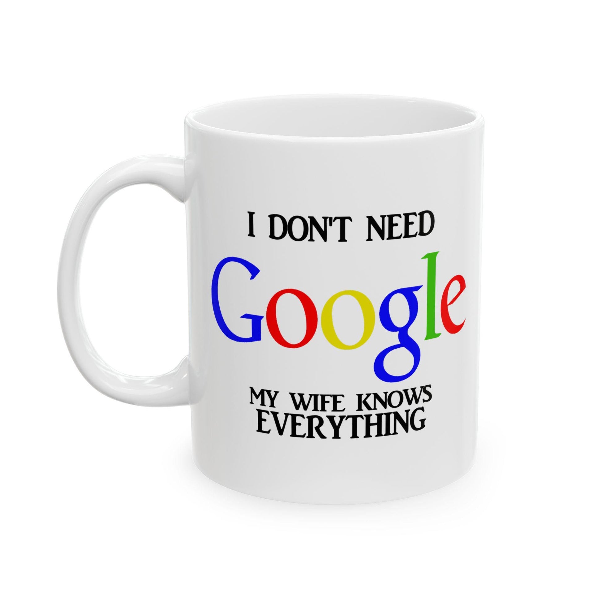 This ceramic mug is designed with the humorous phrase 'I don't need Google My Wife Knows Everything', giving off a lighthearted and fun vibe. It's perfect for those who appreciate witty jokes and want to add some humor to their morning routine. Ideal for husbands, wives, or couples celebrating anniversaries, birthdays, or Valentine's Day.